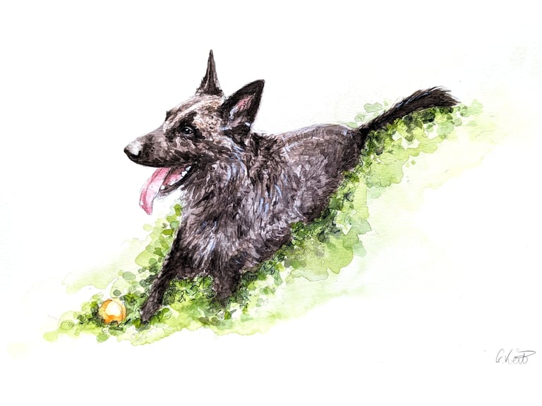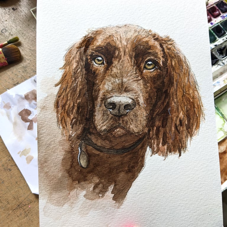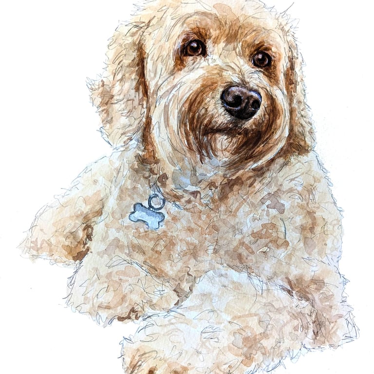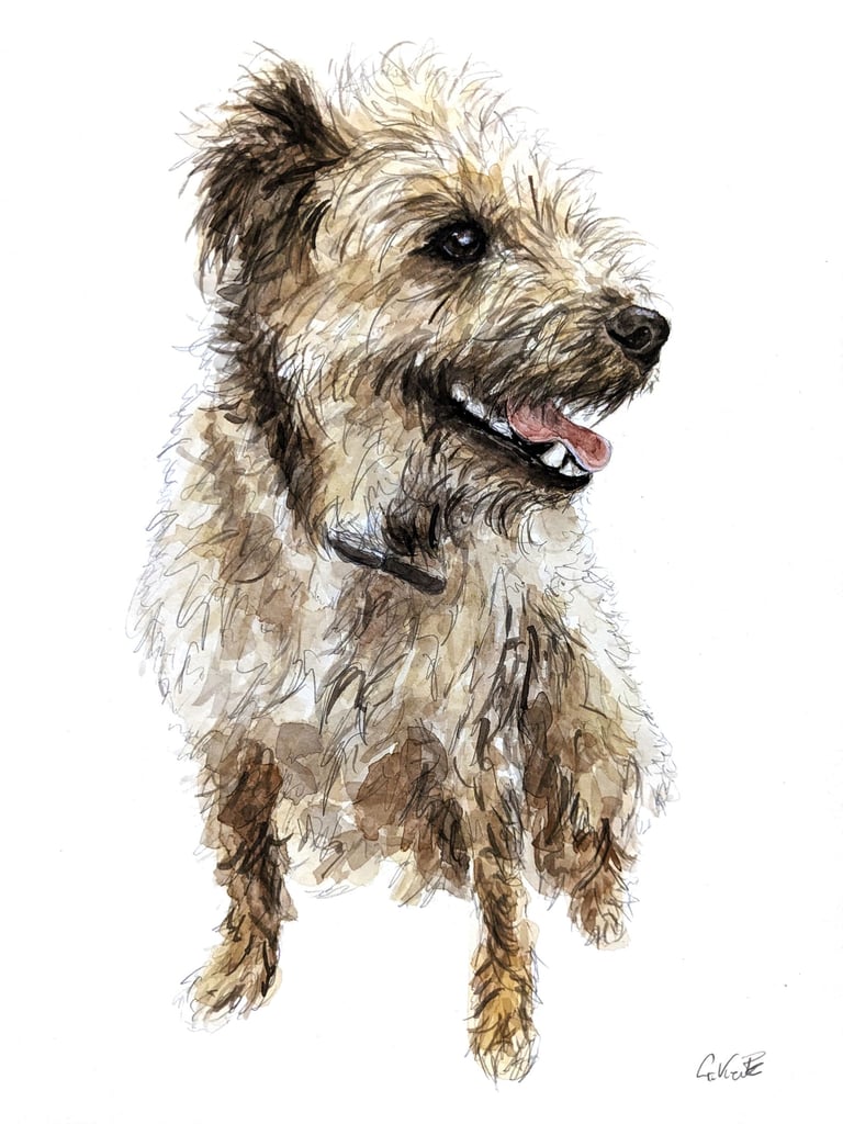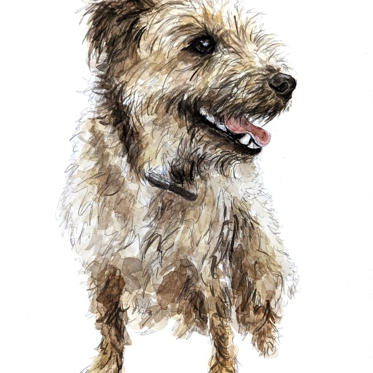My watercolour portrait are by far the most popular choice for my customers. This style is a lovely way to show off their fluffy coats and muddy splatters.
